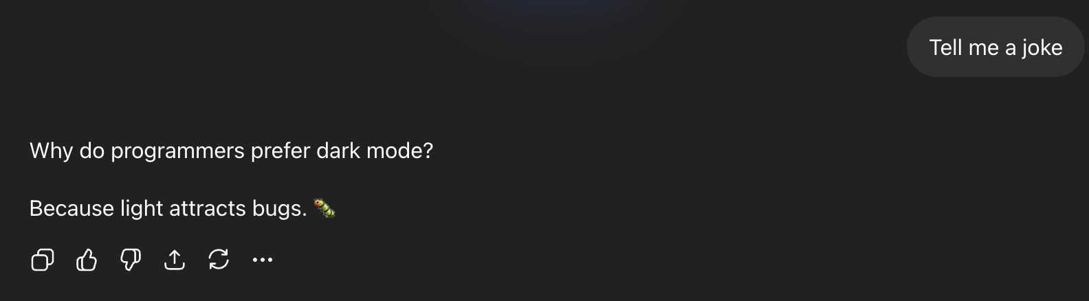I tried this myself to see if Karpathy was right, using the free version of ChatGPT on March 22nd, 2026 (this isn't a very reproducible experiment, because OpenAI hides which model is being used on the free version). On the fourth try, ChatGPT repeated the same joke as the third try: